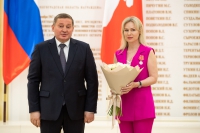 «Сегодня, накануне государственного праздника Дня России, мы чествуем людей, заслуживших высокое государственное признание. Вас, представителей самых разных профессий, объединяют высокий профессионализм, любовь к труду и преданность выбранному делу. Вы трудитесь с полной самоотдачей, спасаете жизни и здоровье людей, участвуете в выполнении приоритетных задач и реализации проектов развития Волгоградской области. Отдельно отмечу большой личный вклад присутствующих здесь врачей и руководителей сферы здравоохранения Волгоградской области в организацию работы по преодолению пандемии новой коронавирусной инфекции. Вы сделали и продолжаете вместе со своими товарищами делать всё зависящее, чтобы этот новый вызов времени как можно скорее стал историей, — отметил Андрей Бочаров, поблагодарив присутствующих за ответственное, неравнодушное отношение к делу, к родной земле. — Результаты вашего многолетнего добросовестного труда вносят существенный вклад в социально-экономическое развитие Волгоградской области и всей нашей страны. Прошу передать слова благодарности вашим трудовым коллективам — без их помощи и поддержки такие высокие профессиональные успехи были бы невозможны. Для меня сегодня большая честь от имени Президента России, от имени жителей Волгоградской области вручить вам высокие государственные награды Российской Федерации и награды Волгоградской области. И, конечно, поздравить вас и всех жителей с наступающим праздником — с Днём России!».